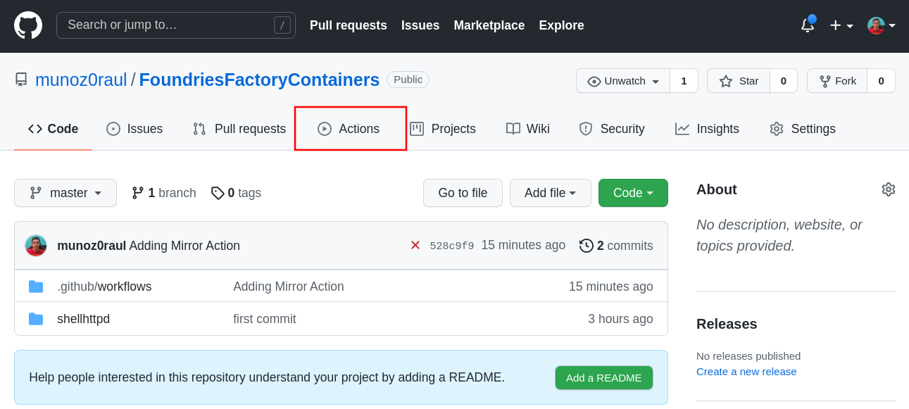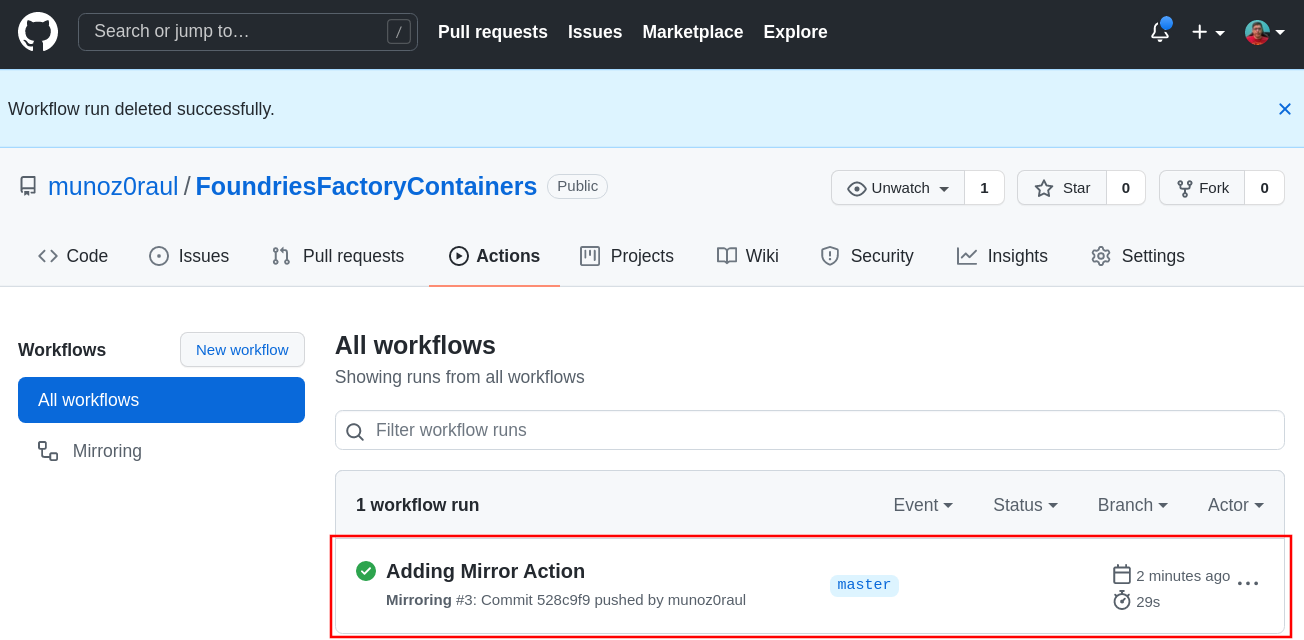 Once mirror.yml is in place, every change to the configured branch will trigger a GitHub Action that mirrors it to you FoundriesFactory Repo.