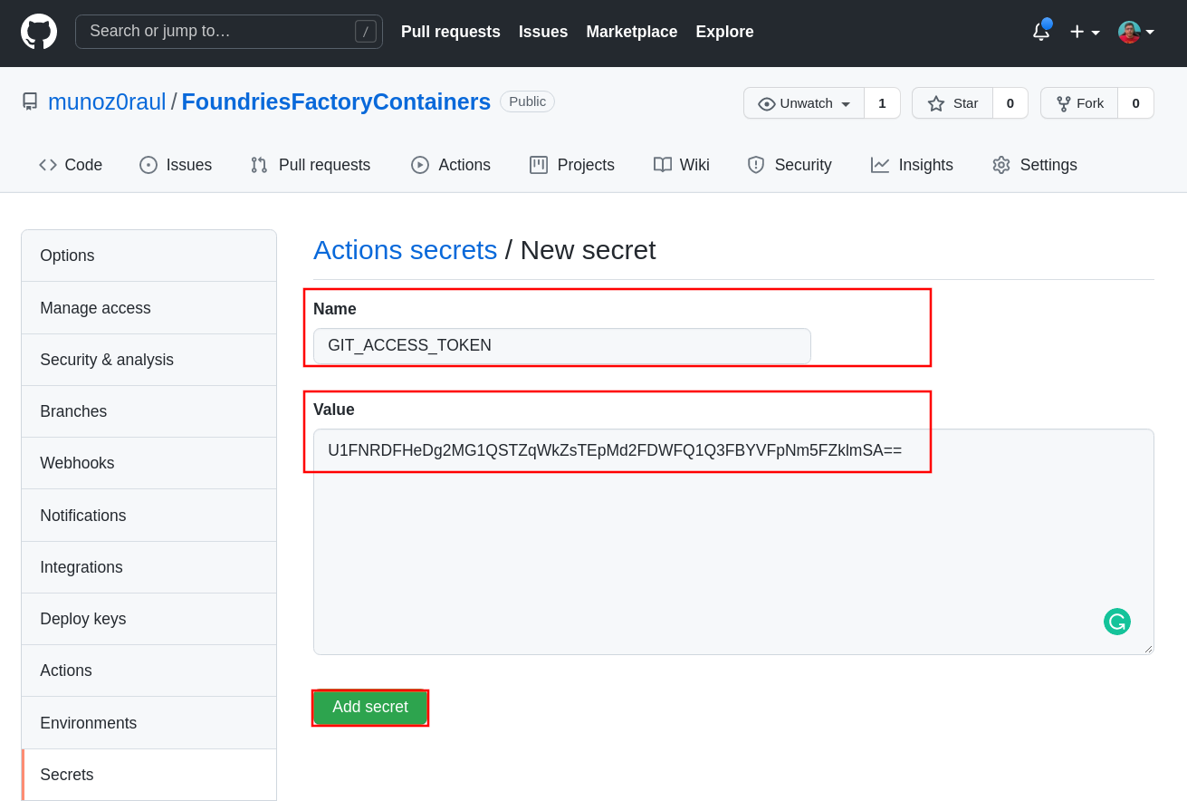 However, complete the Name with GIT_ACCESS_TOKEN, and on Value paste the <BASE64_FIO_TOKEN> provided above.