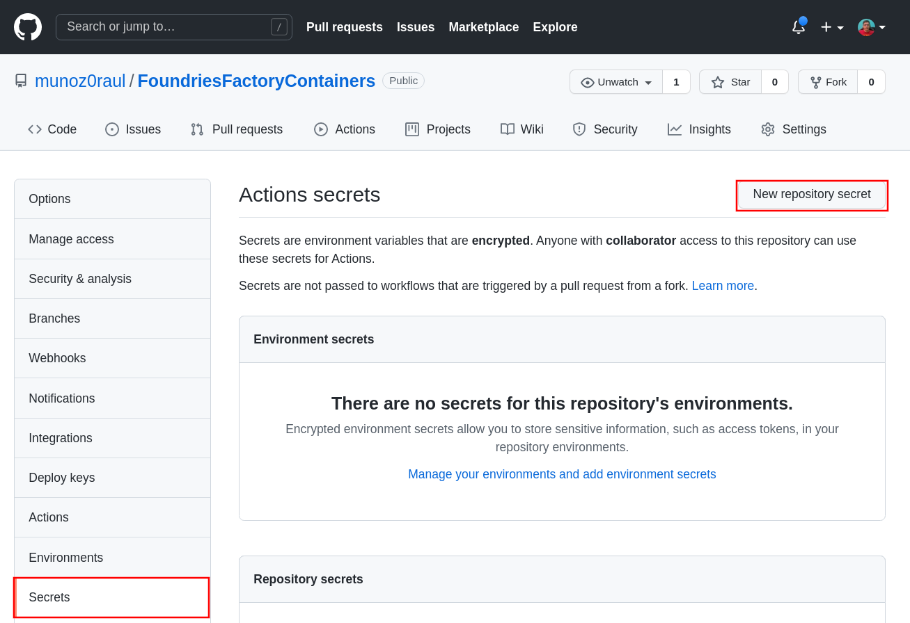 Click on Secrets and create a new secret by clicking on New repository secret.